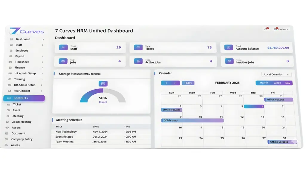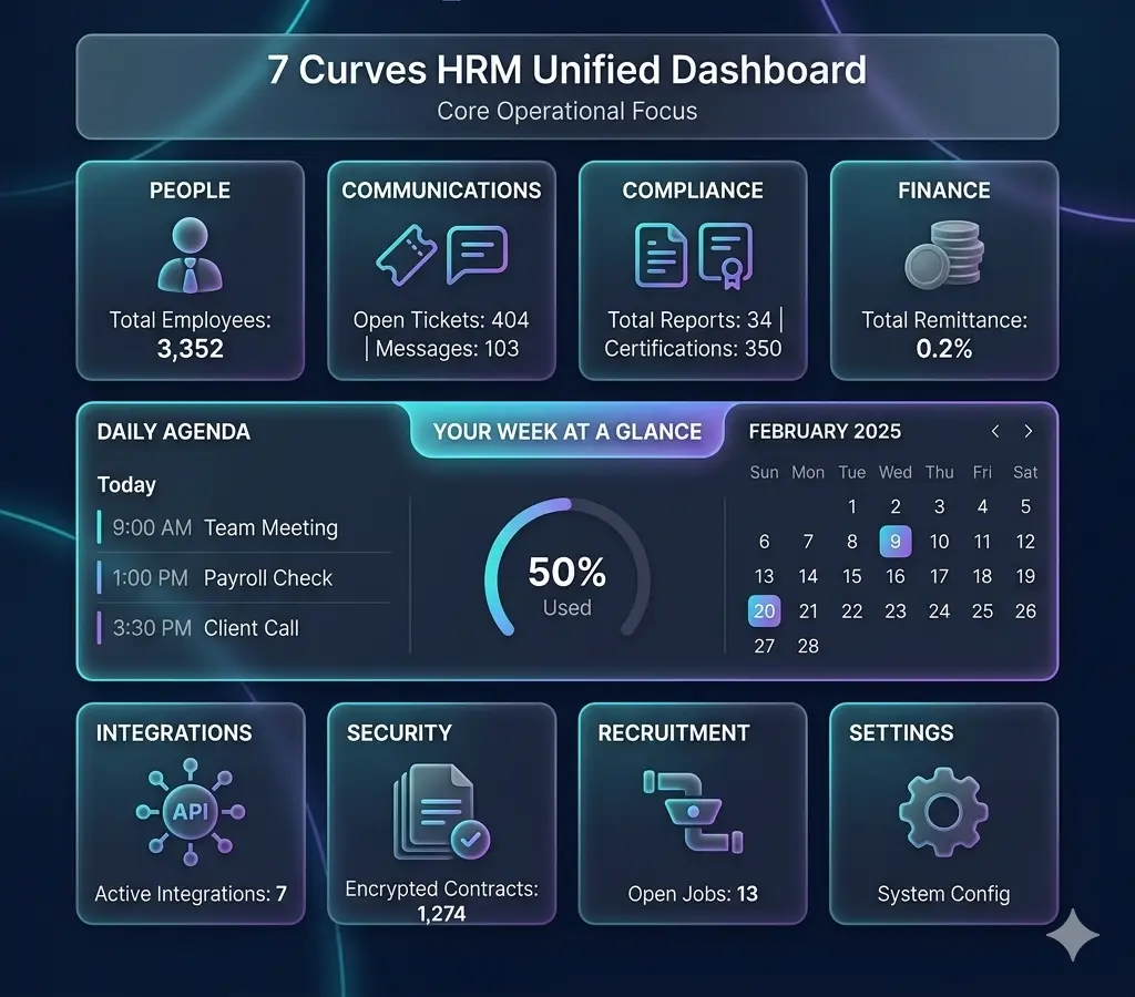 Experience the 7 Curves Unified Dashboard: A centralized powerhouse that simplifies workforce analytics, storage tracking, and calendar management at a glance. Elevate your strategic decision-making by turning complex HR data into immediate, actionable insights, all within a single, secure interface.